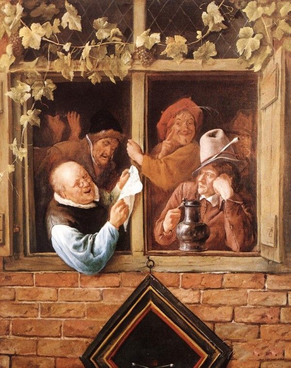 扬·斯丁《窗台上的争论》作品介绍:外文名Rhetoricians at a Window;画布,油彩Oil on canvas;纵75.9厘米,横58.6厘米;作于1660 - 1662 年;藏于美国宾州费城艺术博物馆 Philadelphia Museum of Art。