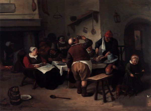 扬·斯丁作品介绍:外文名Jan Steen,生于1626年,卒于1679年,荷兰著名风俗画家,出生于荷兰莱登城,他首先师从荷兰著名风俗画家奥斯塔德Ostade,Andrian van学习绘画,后又师从他的岳父荷兰著名画家扬·凡·霍延学习油画技巧。他的一生主要从事风俗画创作,作品影响很广,在当时声誉仅次于哈尔斯和伦勃朗。他画的宗教题材也带有浓厚的现实风俗特征,画面构图和人物形象构成的场面类似于舞台,所以他即使描绘普通平凡的日常生活,也有一种舞台戏剧效果,很注重人物某些细节的描绘,带有故事性,还略带幽默感,这些都体现了当时的荷兰人民对快乐的精神生活的向往。扬·斯丁不仅是一位著名的风俗画家,也是一位优秀的风景画画家。他的绘画作品,不论是素描还是色彩,都显示出其熟练的造型艺术技巧,尤以色彩和笔触,均凝练、浑厚、沉稳,有的风俗场面,造型类似勃鲁盖尔的朴实无华,有的热情响亮,更重要的是画中充满浓郁的生活气息。这与画家对现实生活的真实体验是分不开的。(1670年画家44岁时重返莱登居住,在那里不能靠画笔谋生,他开了一个小酒馆,他很喜欢这个副业,因为经营的酒店给了他一个观察人们喝酒狂欢的机会,给他增加了喜剧人物形象的储存。他的风俗画之所以让人感到亲切,正是画家亲身经历所致,他将自己真诚的感受传达给了观赏者。)