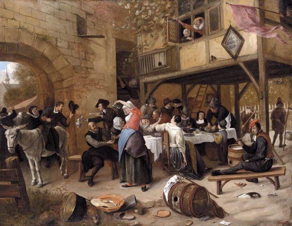 扬·斯丁《出城》作品介绍:这件作品创作于1677年,此时荷兰与英法之间的战争,以荷兰军民的胜利而告一段落。作品表现的是人们离散前在城外酒店外相互告别、相约大水退后重建家园时的感人场面。