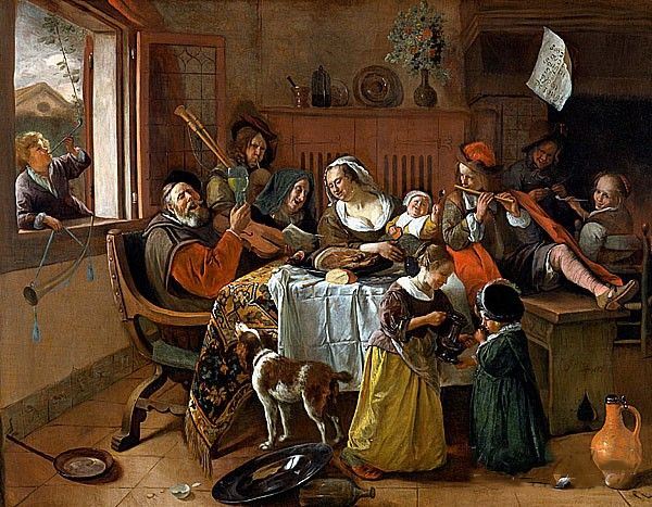 扬·斯丁《快乐的家庭》作品介绍:外文名The Merry Family;画布,油彩Oil on canvas;纵110.5厘米,横141厘米;作于1668年;藏于荷兰阿姆斯特丹国立博物馆 Rijksmuseum, Amsterdam。
