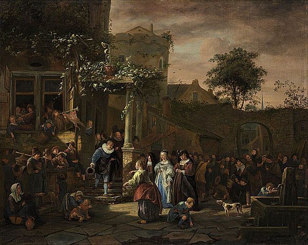 扬·斯丁作品介绍:外文名Jan Steen,生于1626年,卒于1679年,荷兰著名风俗画家,出生于荷兰莱登城,他首先师从荷兰著名风俗画家奥斯塔德Ostade,Andrian van学习绘画,后又师从他的岳父荷兰著名画家扬·凡·霍延学习油画技巧。他的一生主要从事风俗画创作,作品影响很广,在当时声誉仅次于哈尔斯和伦勃朗。他画的宗教题材也带有浓厚的现实风俗特征,画面构图和人物形象构成的场面类似于舞台,所以他即使描绘普通平凡的日常生活,也有一种舞台戏剧效果,很注重人物某些细节的描绘,带有故事性,还略带幽默感,这些都体现了当时的荷兰人民对快乐的精神生活的向往。扬·斯丁不仅是一位著名的风俗画家,也是一位优秀的风景画画家。他的绘画作品,不论是素描还是色彩,都显示出其熟练的造型艺术技巧,尤以色彩和笔触,均凝练、浑厚、沉稳,有的风俗场面,造型类似勃鲁盖尔的朴实无华,有的热情响亮,更重要的是画中充满浓郁的生活气息。这与画家对现实生活的真实体验是分不开的。(1670年画家44岁时重返莱登居住,在那里不能靠画笔谋生,他开了一个小酒馆,他很喜欢这个副业,因为经营的酒店给了他一个观察人们喝酒狂欢的机会,给他增加了喜剧人物形象的储存。他的风俗画之所以让人感到亲切,正是画家亲身经历所致,他将自己真诚的感受传达给了观赏者。)