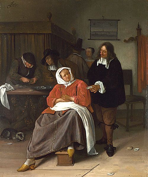 扬·斯丁作品介绍:外文名Jan Steen,生于1626年,卒于1679年,荷兰著名风俗画家,出生于荷兰莱登城,他首先师从荷兰著名风俗画家奥斯塔德Ostade,Andrian van学习绘画,后又师从他的岳父荷兰著名画家扬·凡·霍延学习油画技巧。他的一生主要从事风俗画创作,作品影响很广,在当时声誉仅次于哈尔斯和伦勃朗。他画的宗教题材也带有浓厚的现实风俗特征,画面构图和人物形象构成的场面类似于舞台,所以他即使描绘普通平凡的日常生活,也有一种舞台戏剧效果,很注重人物某些细节的描绘,带有故事性,还略带幽默感,这些都体现了当时的荷兰人民对快乐的精神生活的向往。扬·斯丁不仅是一位著名的风俗画家,也是一位优秀的风景画画家。他的绘画作品,不论是素描还是色彩,都显示出其熟练的造型艺术技巧,尤以色彩和笔触,均凝练、浑厚、沉稳,有的风俗场面,造型类似勃鲁盖尔的朴实无华,有的热情响亮,更重要的是画中充满浓郁的生活气息。这与画家对现实生活的真实体验是分不开的。(1670年画家44岁时重返莱登居住,在那里不能靠画笔谋生,他开了一个小酒馆,他很喜欢这个副业,因为经营的酒店给了他一个观察人们喝酒狂欢的机会,给他增加了喜剧人物形象的储存。他的风俗画之所以让人感到亲切,正是画家亲身经历所致,他将自己真诚的感受传达给了观赏者。)