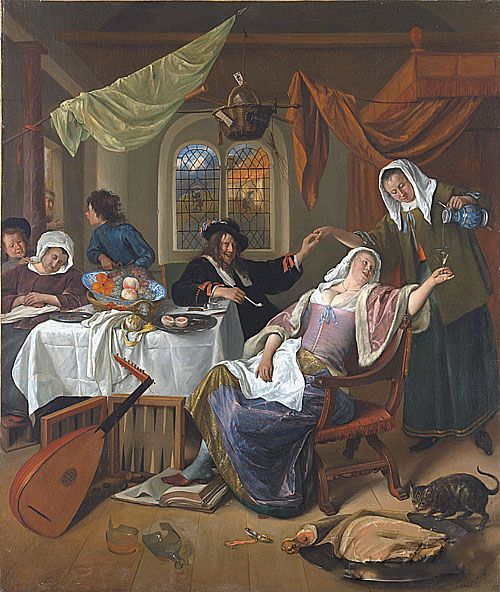 扬·斯丁《放荡的家庭》作品介绍:外文名The Dissolute Household;画布,油彩Oil on canvas;纵108厘米,横90.2厘米;作于1663 - 1664 年;藏于美国纽约大都会美术馆 Metropolitan Museum of Art, New York。