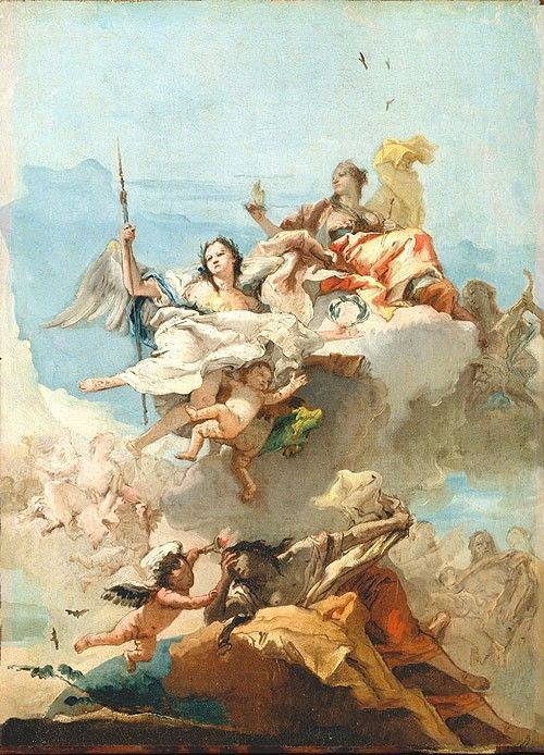 提埃波罗《美德与高尚》作品介绍:外文名Virtue and Nobility;画布,油彩Oil on canvas;纵53.3厘米,横40厘米;作于 1790 - 1795 年;藏于美国纽约大都会美术馆 Metropolitan Museum of Art, New York。