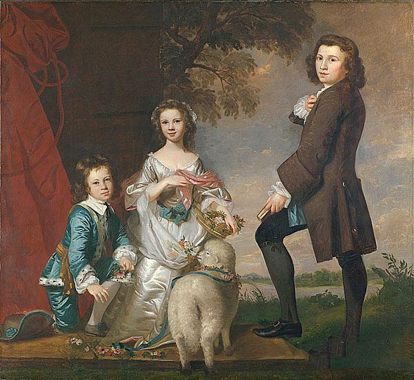 雷诺兹《托马斯和他的导师与玛莎尼特》作品介绍:外文名Thomas and Martha Neate with His Tutor, Thomas Needham;画布,油彩Oil on canvas;纵168厘米,横180.3厘米;作于1748年;藏于美国纽约大都会美术馆 Metropolitan Museum of Art, New York。