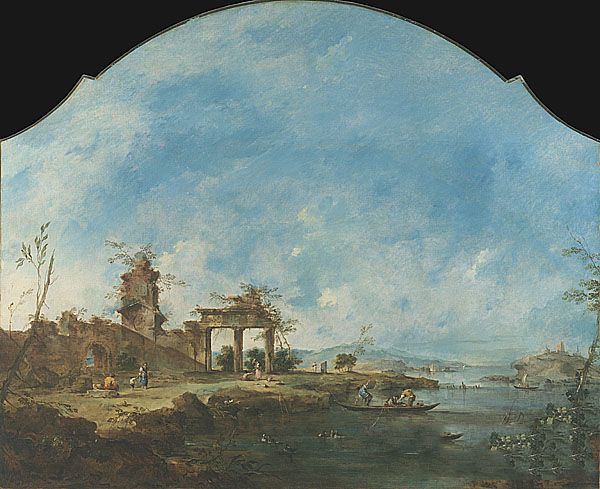 瓜尔迪《梦幻般的景观》作品介绍:外文名Fantastic Landscape;画布,油彩Oil on canvas;纵155.6厘米,横189.2厘米;作于1765年;藏于美国纽约大都会美术棺 Metropolitan Museum of Art, New York 。