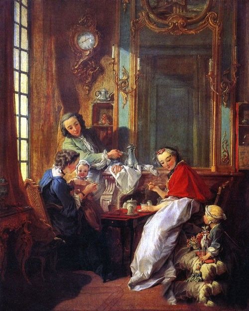 布歇《早晨喝咖啡时间》作品介绍:外文名 Morning Coffee;画布,油彩oil on canvas;纵81.5厘米,横65.5厘米;作于1739 年;藏于法国巴黎罗浮宫 Musee du Louvre, Paris。